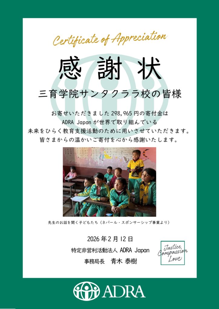 ADRA Japanより感謝状をいただきました